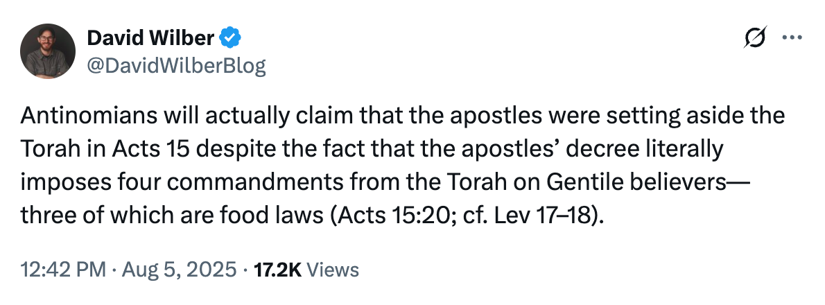 Antinomians will actually claim that the apostles were setting aside the Torah in Acts 15 despite the fact that the apostles’ decree literally imposes four commandments from the Torah on Gentile believers—three of which are food laws (Acts 15:20; cf. Lev 17–18).
